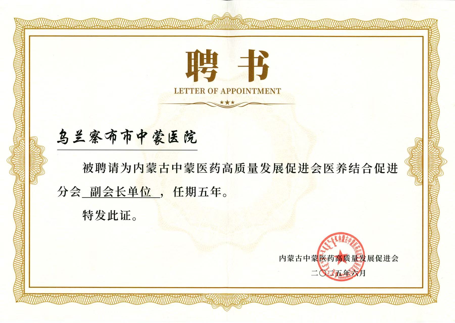 内蒙古中蒙医药高质量发展促进会医养结合促进分会副会长单位聘书