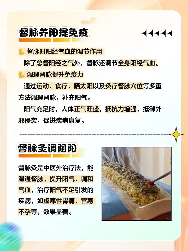 1.激发人体阳气:督脉是奇经八脉之一,总督一身阳气。督脉灸可以通经活络、通阳止痛,适用于阳气不足或老年人阳虚、水肿等症状。