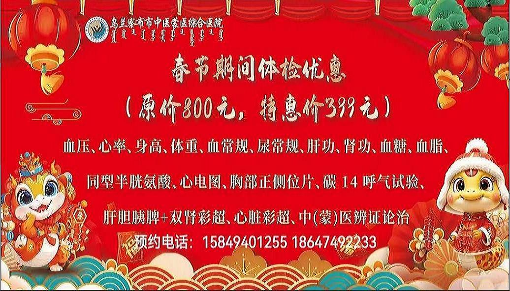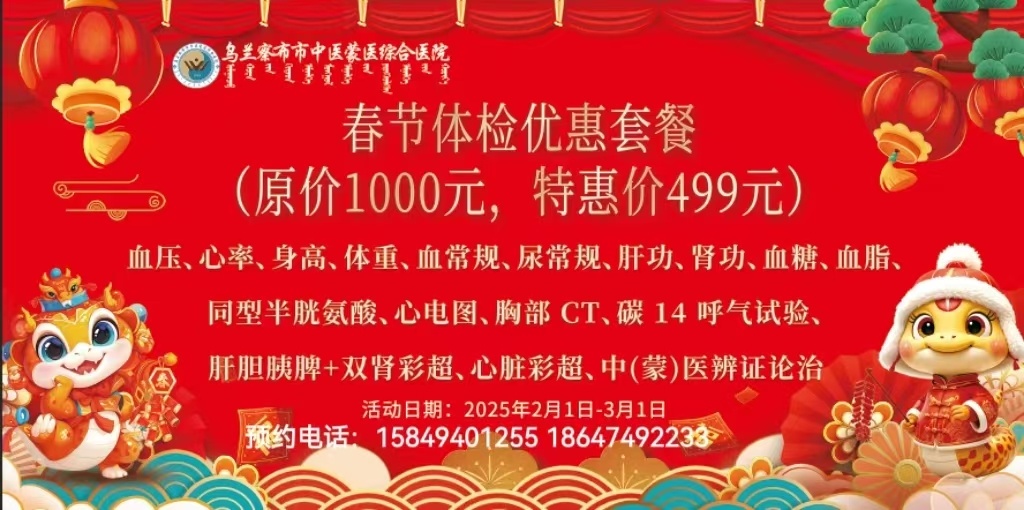 乌兰察布市中医蒙医综合医院春节期间,体检中心不打烊,原价800元的体检套餐,现特惠价仅需399元,以及原价1000的体检套餐,现特惠价仅需499元,涵盖多项基础及深度检查项目,还有中(蒙)医辨证论治,为您的健康精准把关。活动时间:2025年2月1日--2025年3月1日