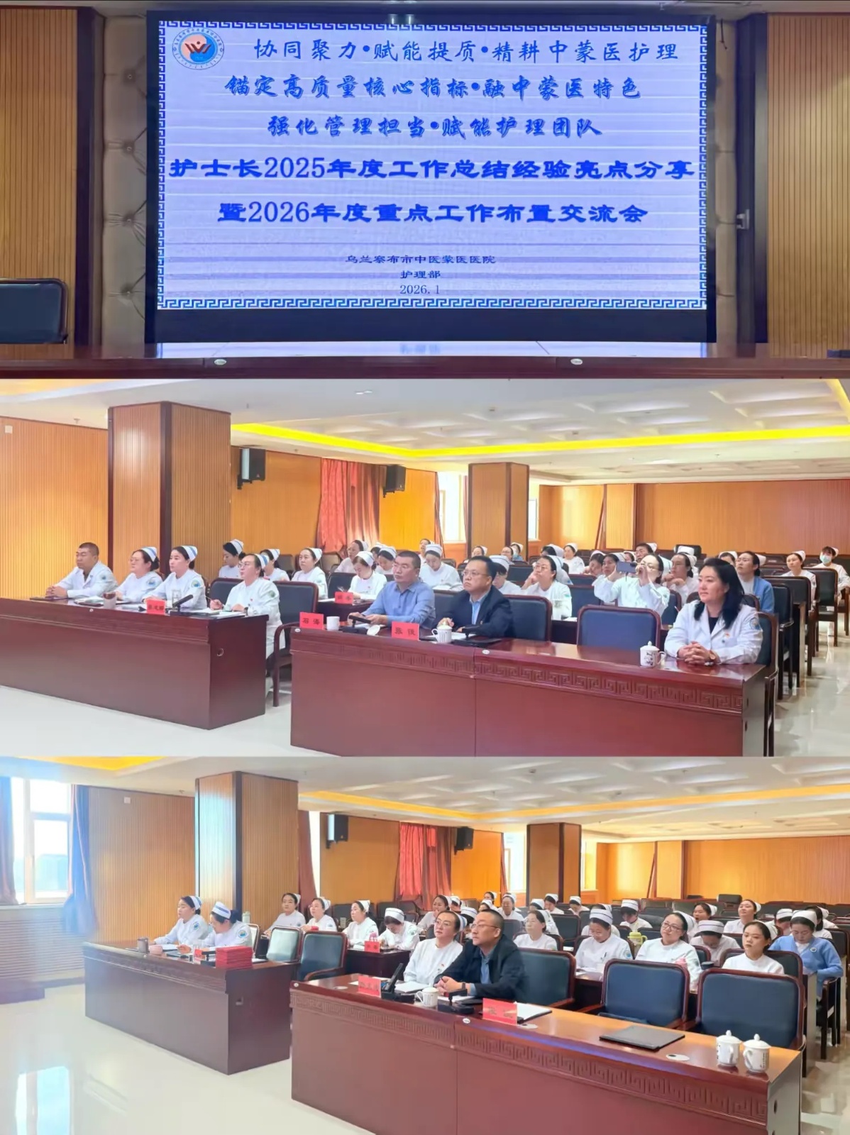 为全面总结2025年度护理工作成效,科学谋划2026年发展蓝图,进一步提升护理管理效能,推动中(蒙)医护理深度融合与高质量发展,乌兰察布市中医蒙医医院护理部于2026年1月15、16日14:30时分两下午组织召开“锚定高质量核心指标,融中(蒙)医特色,强化管理担当,赋能护理团队”护士长2025年度工作总结经验亮点分享与2026年度重点工作布置交流会。热烈欢迎党委副书记孙文涛、纪委书记张俊、副院长石海及纪检监察室主任包丽娜亲临现场指导工作;护理部樊建卿主任主持会议。