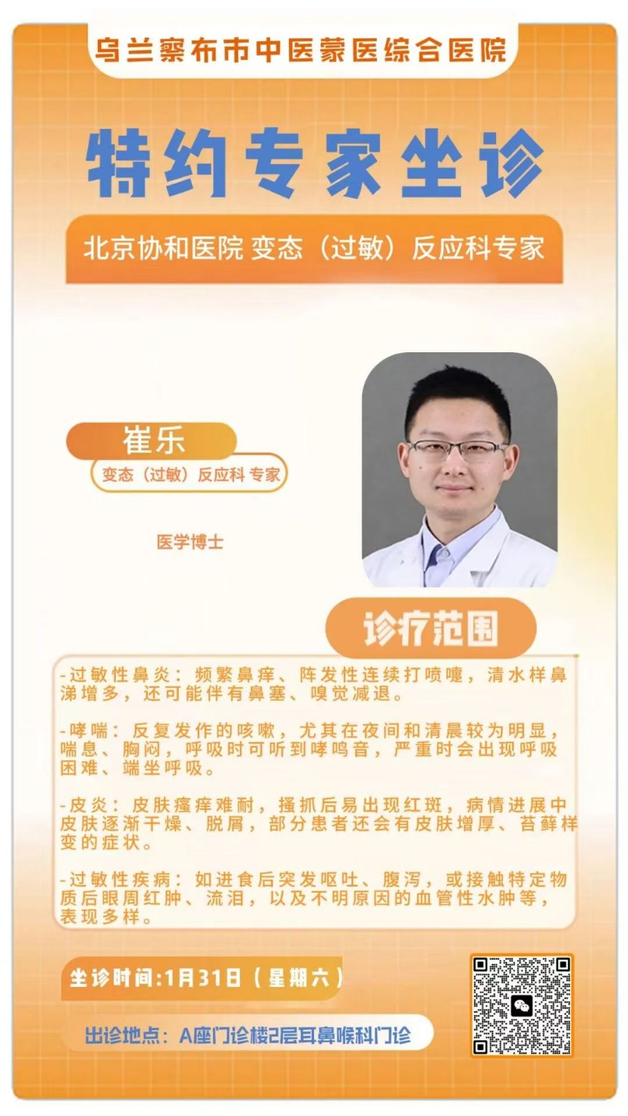 崔乐(过敏科):过敏性鼻炎、哮喘、荨麻疹患者,携带过敏原检测报告,精准用药不踩坑!(1.31 周六)