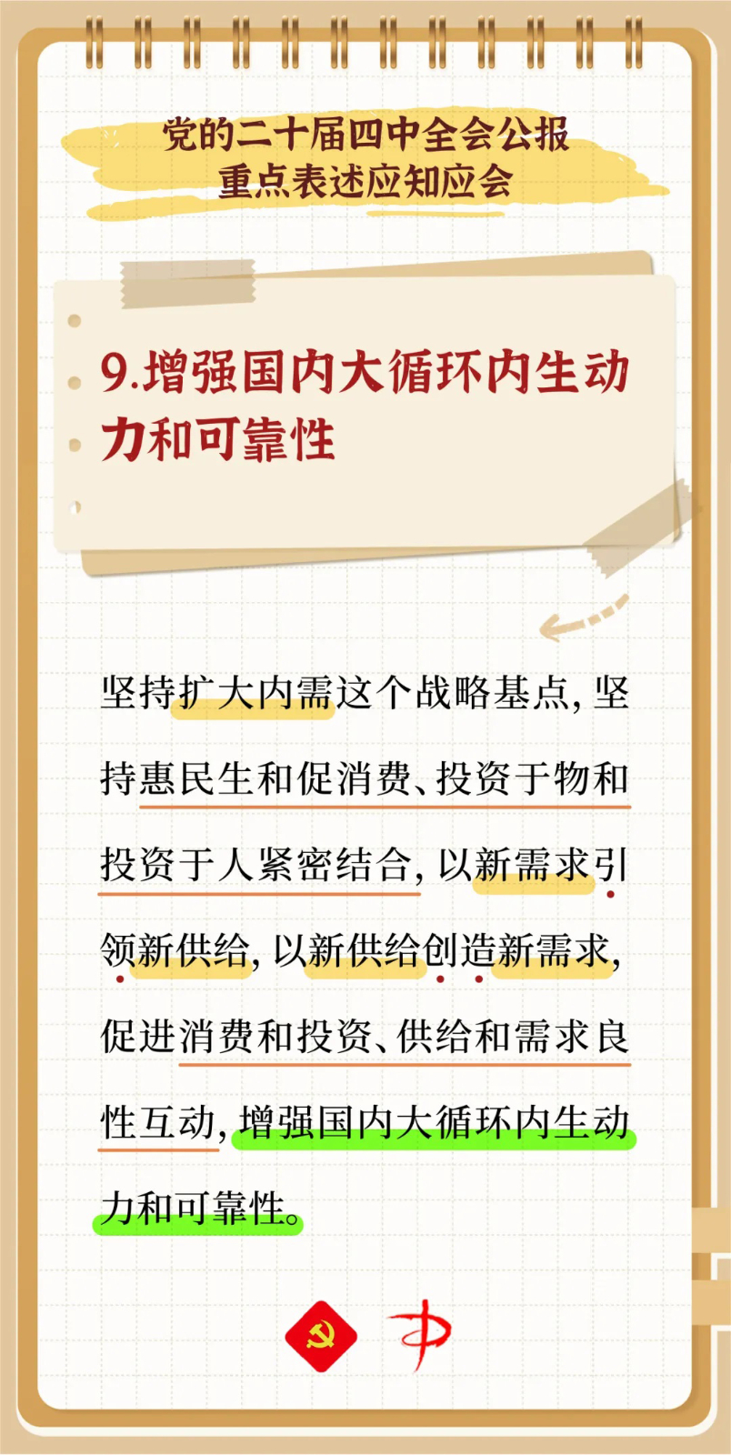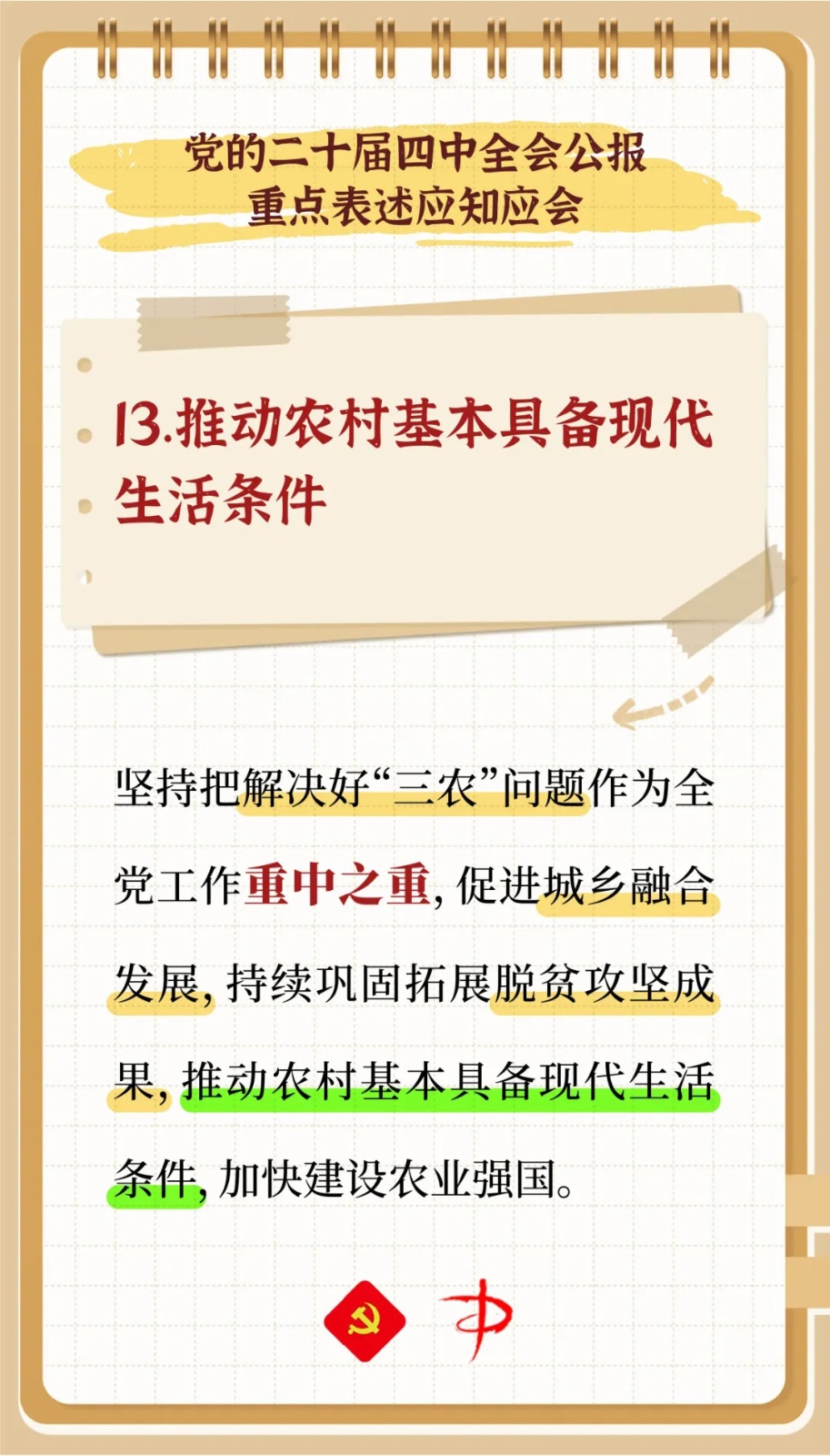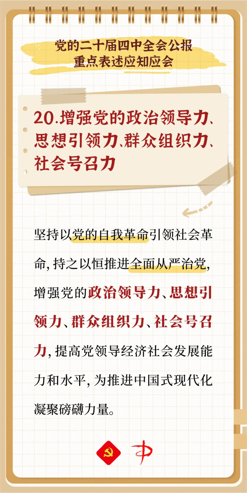 中国共产党第二十届中央委员会第四次全体会议,于2025年10月20日至23日在北京举行。为提高广大党员政治理论素养,丰富基层党组织学习素材,特别推出《中国共产党第二十届中央委员会第四次全体会议公报重点表述应知应会》,一起来看看吧!