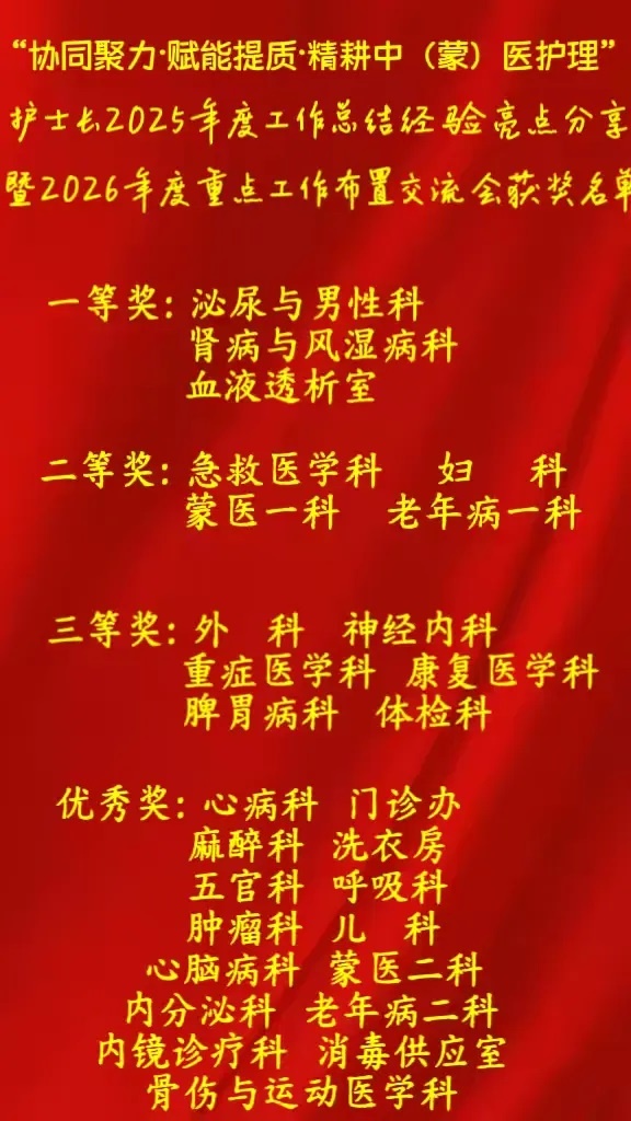 各科室护士长围绕2025年度工作实践,案例实效,依次进行经验分享。发言紧扣“中(蒙)医特色融入”“护理质量提升”“团队能力建设”三大主线,系统回顾了各科室在优质护理服务推进、专科护理内涵深化、患者满意度提升等方面取得的成果。部分科室通过开展耳穴压豆、穴位贴敷、拔罐、艾灸等中医适宜技术及蒙医传统疗术,显著改善患者症状感知与康复体验,形成具有中(蒙)医特色的护理服务模式。同时,通过优化排班机制、落实责任包干制、推进分层培训体系建设,有效提升了护理工作效率与团队凝聚力。