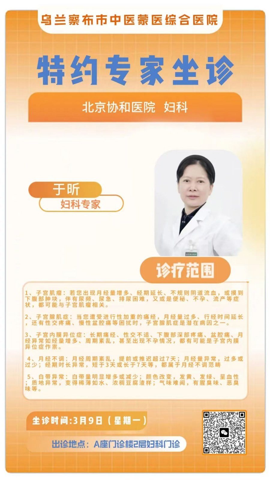 抢号难、路费贵、看诊来回折腾?别愁!3月9-12日(周一-周四),乌兰察布市中医蒙医综合医院特邀协和、同仁、广安门等顶尖三甲医院专家坐诊,妇科、中医、眼科全覆盖,对症看更省心!