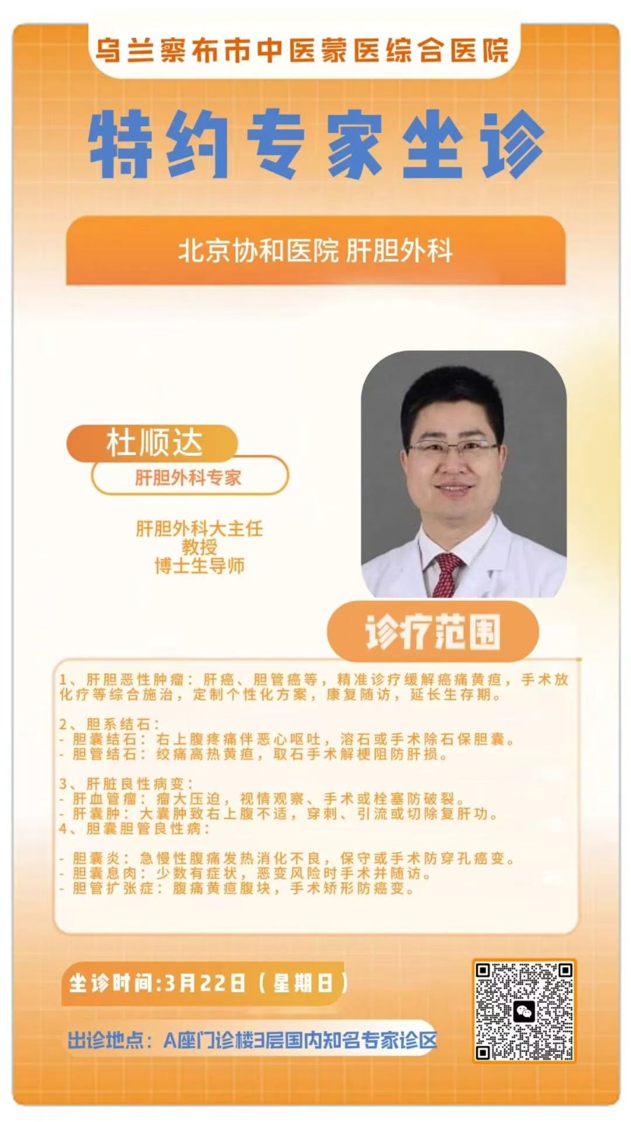 - 杜顺达(北京协和医院·肝胆外科现任主任):擅长肝血管瘤、肝腺瘤、胆管结石及并发症等疾病的诊疗,记得提前带CT报告,专家现场解读!(3.22 周日)