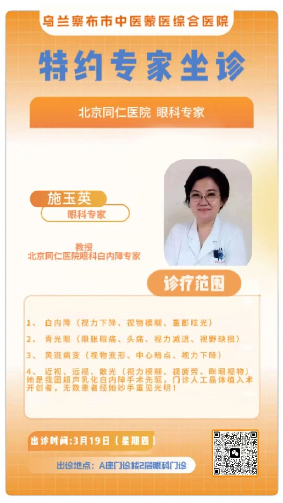 - 施玉英(北京同仁医院·眼科专家):擅长白内障、青光眼、黄斑病变等眼科疾病的治疗,有手术需求患者可提前预约!本次专家可预约手术。(3.19 周四)
