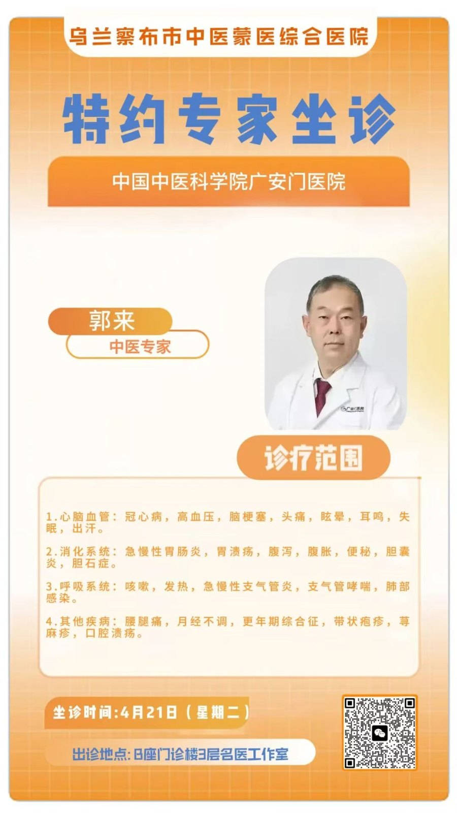 -  郭来(中科院广安门医院·中医科专家):呼吸系统疾病、心脑血管疾病、消化系统疾病问题,提前约检查更省时间!(4.21 周二)